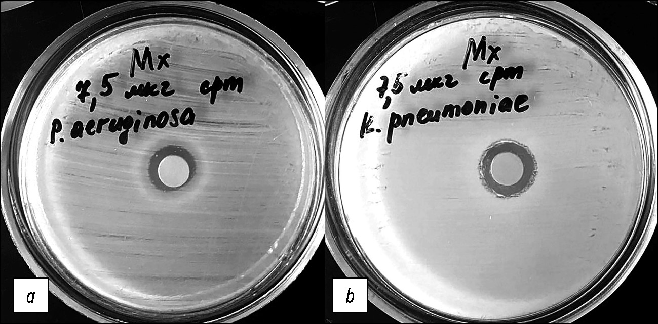 Рис. 4. Воздействие цефепима в концентрации 7,5 мкг в составе композитного покрытия на музейные культуры: a — Pseudomonas aeruginosa, b — Klebsiella pneumoniae.