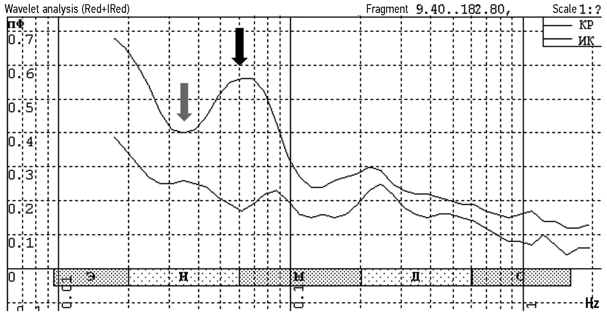 Note. Horizontally — frequency ranges in Hz: e (endothelial), n (neurogenic), m (myogenic), rv (respiratory venular), c (cardiac). Vertically — the amplitude of fluctuations in blood flow in perfusion units. The red arrow indicates the absence of sympathetic adrenergic activity in the infrared channel and its marked decrease in the red recording channel. The blue arrow indicates the pronounced activity of sensory peptidergic regulation in the infrared recording channel.
