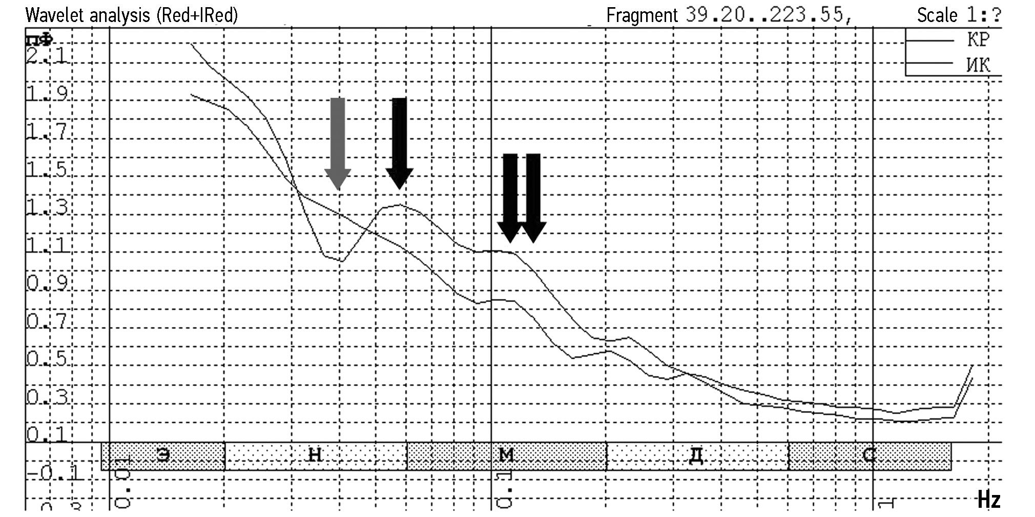Note. Horizontally: frequency ranges in Hz — e (endothelial), n (neurogenic), m (myogenic), rv (respiratory venular), c (cardiac). Vertically — the amplitude of fluctuations in blood flow in perfusion units. The red arrow indicates the absence of sympathetic adrenergic activity in the red and infrared recording channels. The blue arrow is the activation of sensory peptidergic regulation in the infrared recording channel. The double blue arrow is the synchronization of the frequency of myogenic activity in the red and infrared channels.