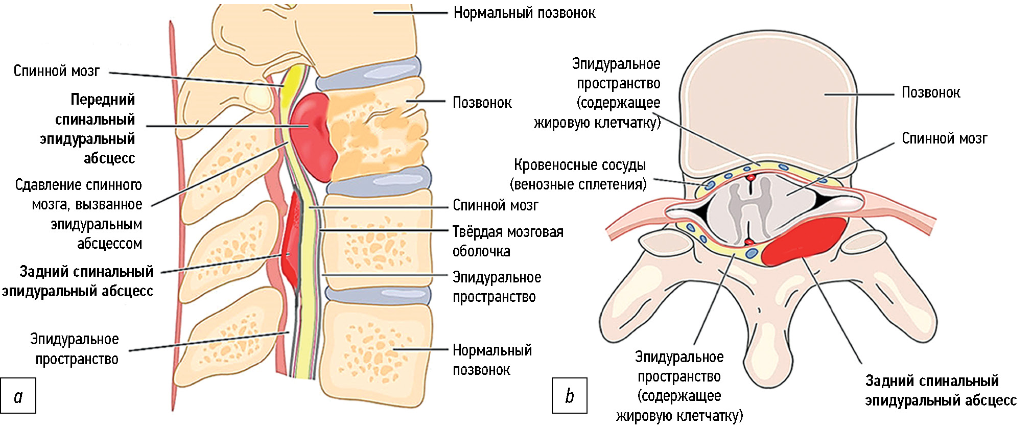 Fig. 1. Location of epidural abscesses in the spinal canal: а — ventral, b — dorsal. Adapted from Tetsuka S., 2020 [45].