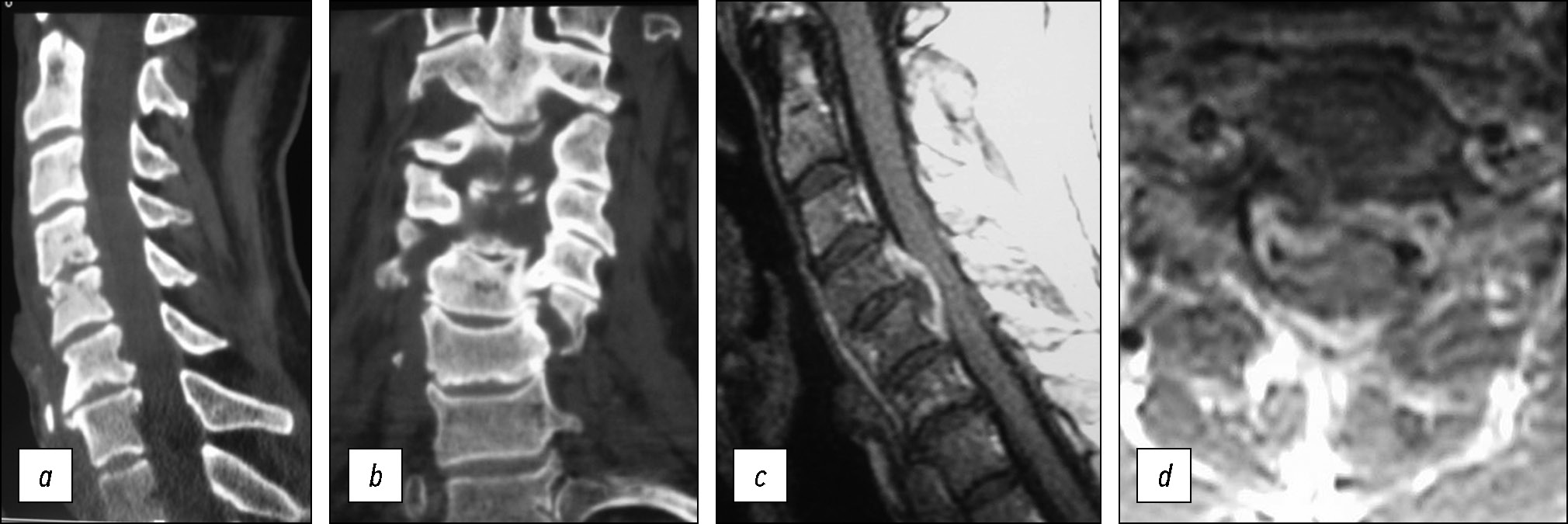 Рис. 2. Спондилодисцит на уровне С4-С5 позвонков. По данным КТ (а, b) выявлена деструкция тел С4-С5 позвонков. На МРТ (c, d) отмечается компрессия спинного мозга на уровне С4-С5 вентрально расположенным эпидуральным абсцессом.