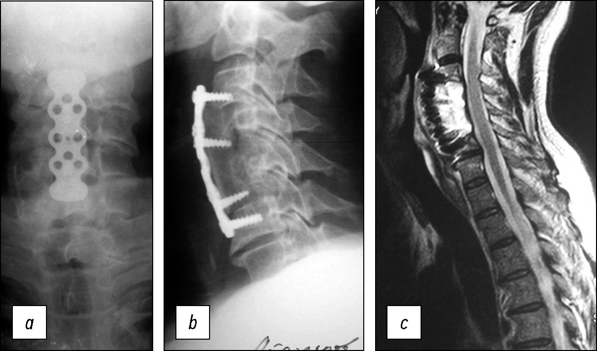 Рис. 3. Послеоперационные снимки: а, b — на рентгенограммах отмечается стабилизация сегмента С3-С6 аутокостью и фиксация цервикальной пластиной, с — на МРТ стеноз позвоночного канала устранён, компрессии спинного мозга нет.