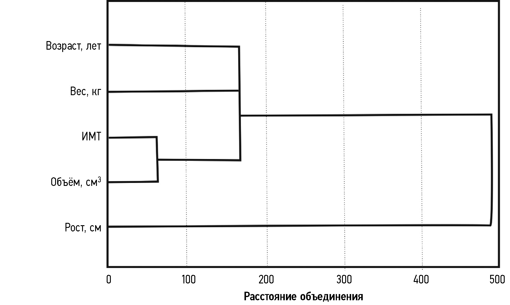 В данном исследовании особый интерес представляет сравнение объёмов ИЖТ у пациентов с различным ИМТ. На основании многомерного кластерного анализа выявлена тесная связь между объёмом ИЖТ и ИМТ (см. рис. 2), что может указывать на патофизиологические механизмы, связанные с распределением жировой ткани в организме, которые влияют на состояние коленных суставов и окружающих тканей и повышают риск развития остеоартроза.