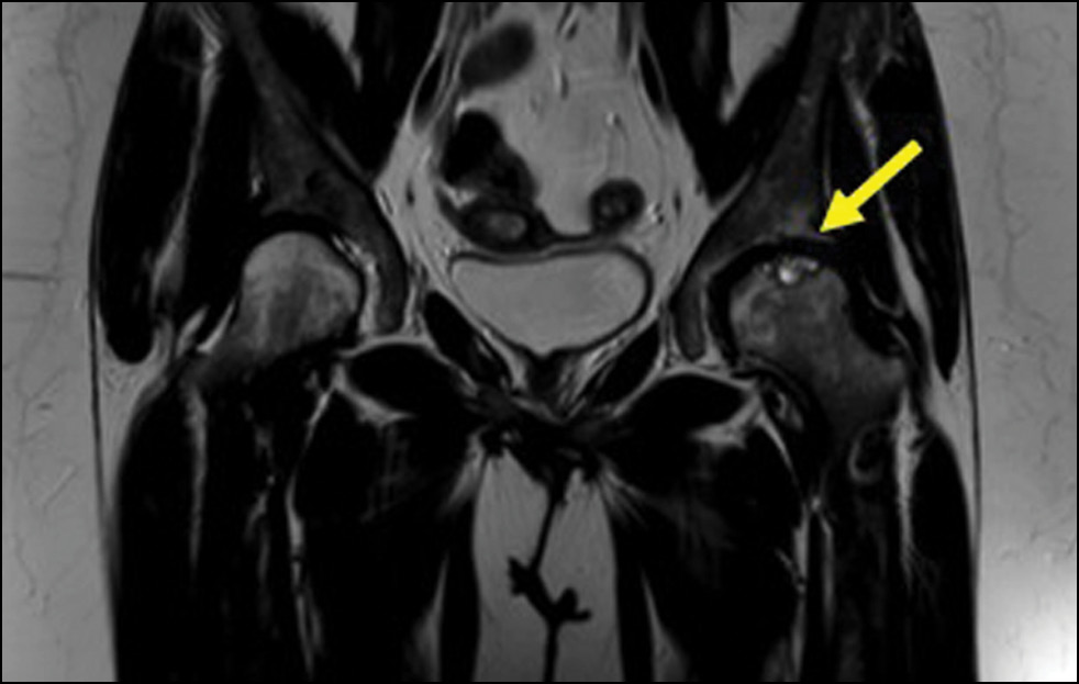 Рис. 1. МРТ тазобедренных суставов (Т2-взвешенное изображение, корональная проекция). II стадия кортикомедуллярного остеонекроза головки левой бедренной кости (симптом двойной линии), тип 2А по классификации АRCO.