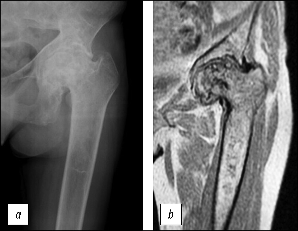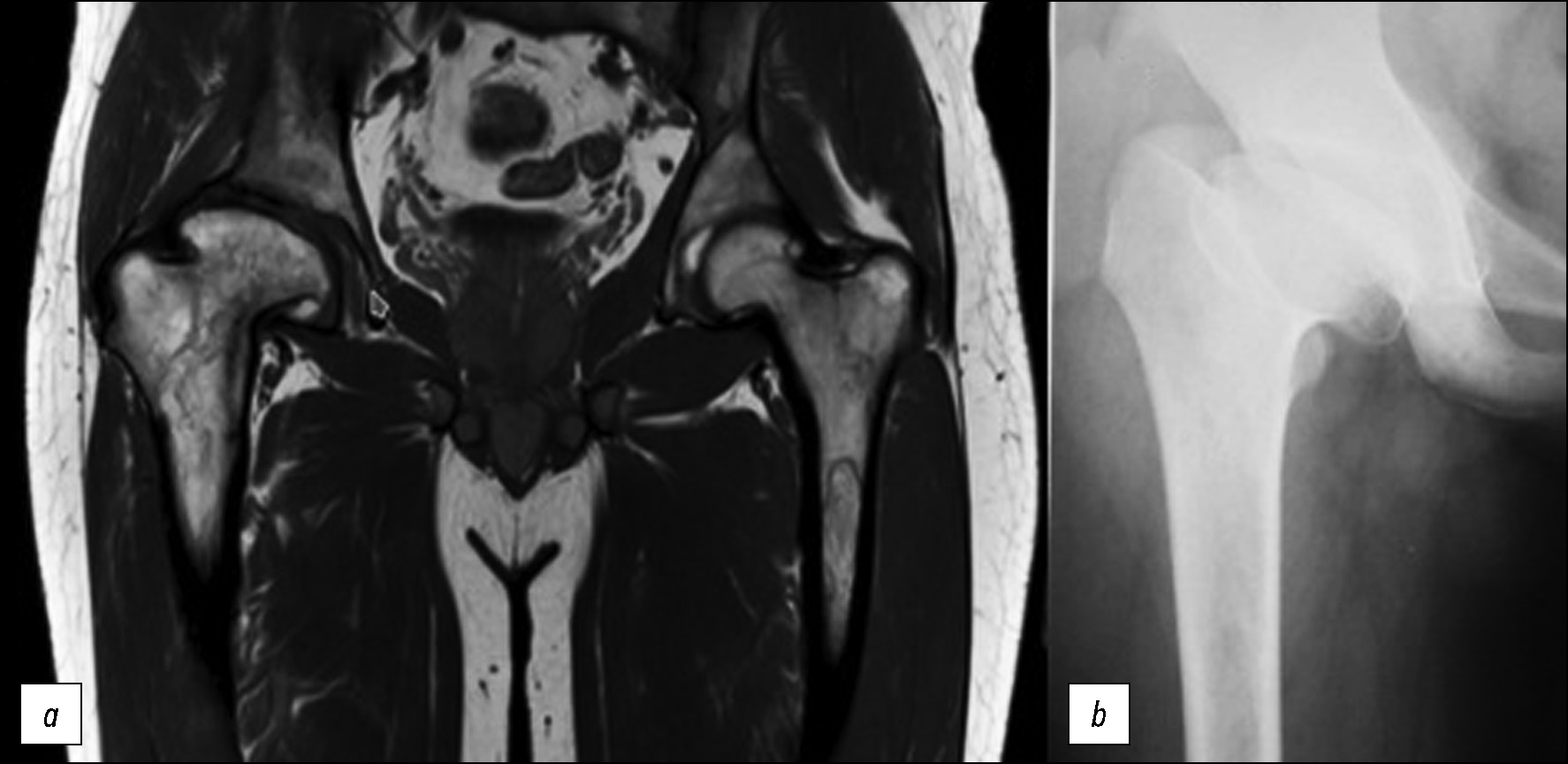 Рис. 4. Рентгенограмма тазобедренного сустава в прямой проекции (a) и фрагмент МРТ Т1-ВИ (b) проксимального отдела бедренной кости. Кортикомедуллярный остеонекроз головки бедренной кости, тип 4 по классификации АRCO. Расширение полости костномозгового канала в проксимальном диафизе бедренной кости с негомогенным разрежением костной ткани на рентгенограмме, а также участками постинфарктного медуллярного остеонекроза на МРТ.
