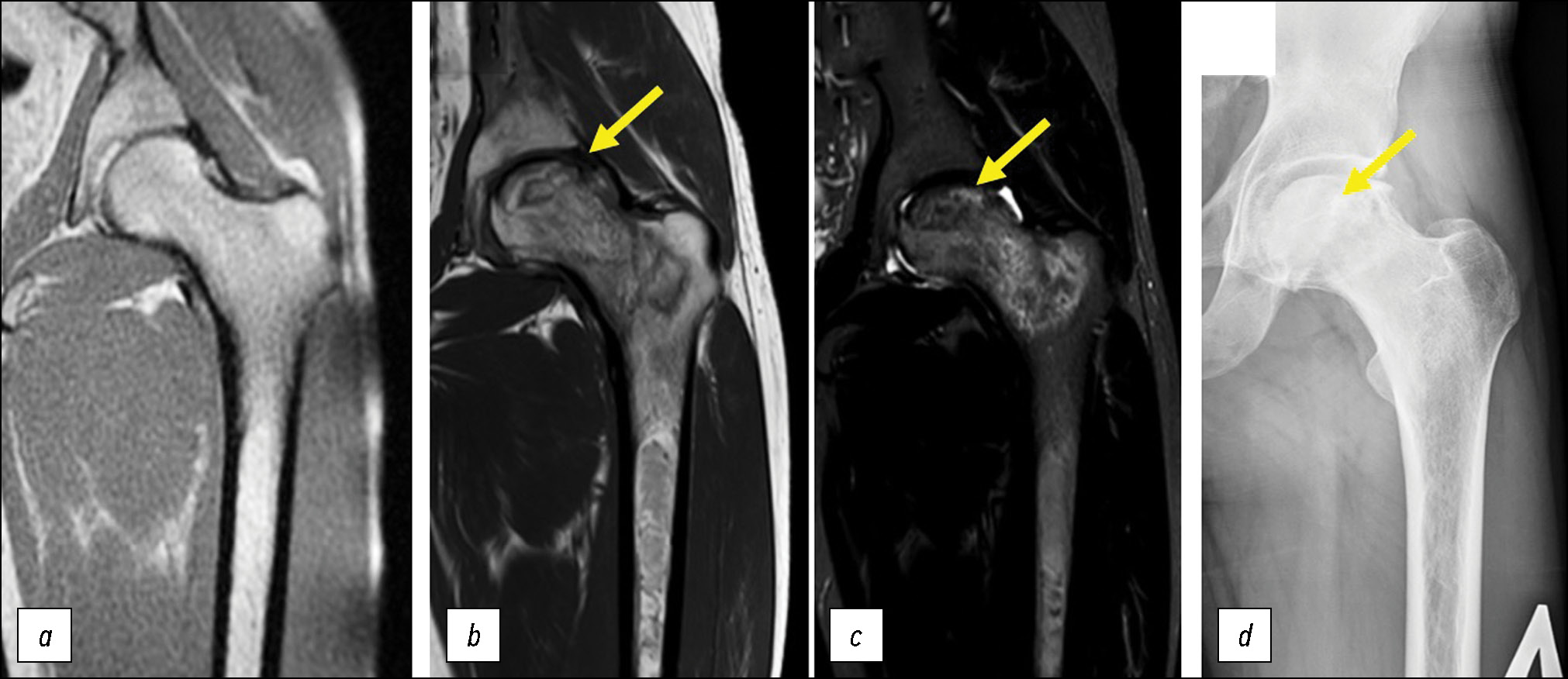 Рис. 3. Фрагмент МРТ тазобедренного сустава через 9 лет заместительной ферментной терапии (Т1-взвешенное изображение, корональная проекция) (а). МРТ через 14 лет заместительной ферментной терапии (b — Т1-взвешенное изображение, с — STIR, корональные проекции). Рентгенограмма того же тазобедренного сустава в прямой проекции через 14 лет заместительной ферментной терапии (d). Стрелкой указан участок кортикомедуллярного остеонекроза с секвестрацией (тип 3В по классификации АRCO).