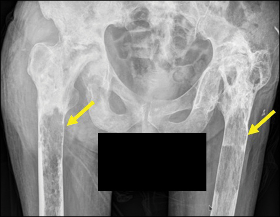 Рис. 5. Рентгенограмма тазобедренных суставов в прямой проекции. Головки бедренных костей разрушены, вертлужные впадины деформированы, суставные щели не прослеживаются. Выраженная перестройка видимых костей с наличием неоднородных участков уплотнения, разнокалиберных (до 4 см) участков разрежения без чётких контуров. Резкое истончение коркового слоя проксимального диафиза бедренных костей (указано стрелкой).