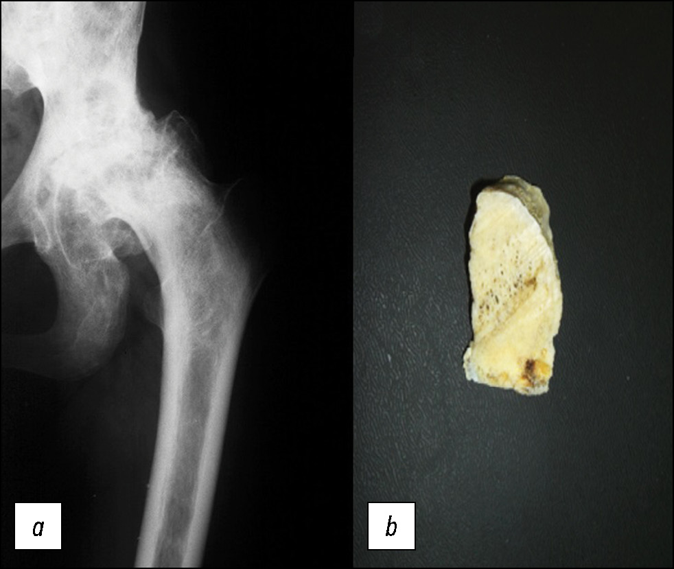 Рис. 6. Рентгенограмма тазобедренного сустава в прямой проекции (a), фотография поперечного опила шейки бедра (b). Резко выраженный коксартроз в исходе кортикомедуллярного остеонекроза головки левой бедренной кости с частичным её разрушением. Участки медуллярного остеонекроза с остеосклерозом в проксимальном метафизе.