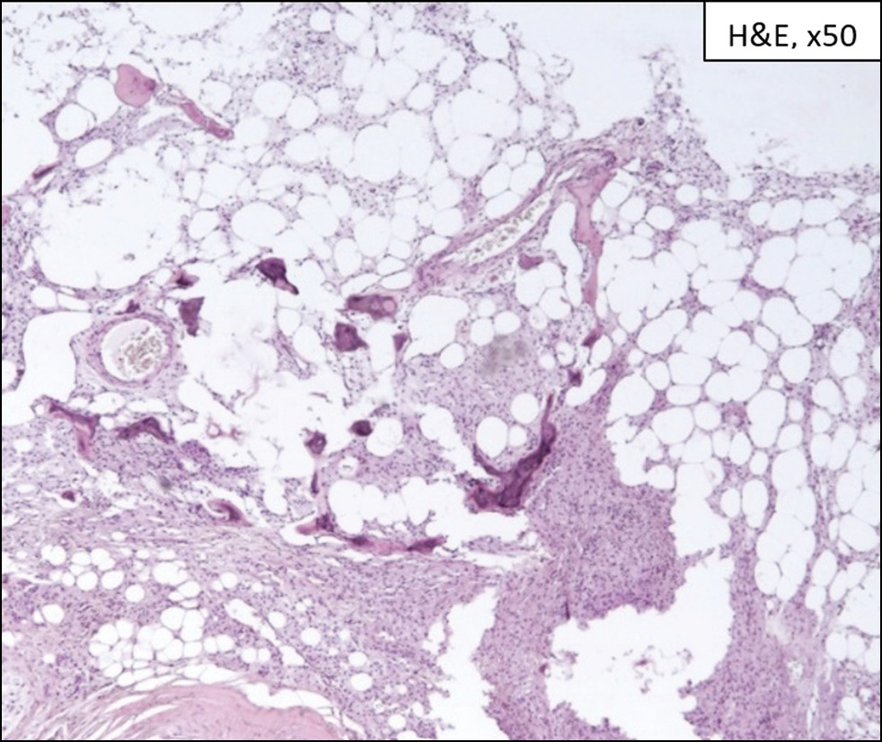 Fig. 7. Microphotogram of histological preparation of the spongy bone of the femoral head in patient with Gaucher disease, stained with hematoxylin and eosin, ×50. Focal interstitial infiltration of bone marrow by Gaucher cells with foci of bone girder reconstruction and mosaic perivascular sclerosis is visible.