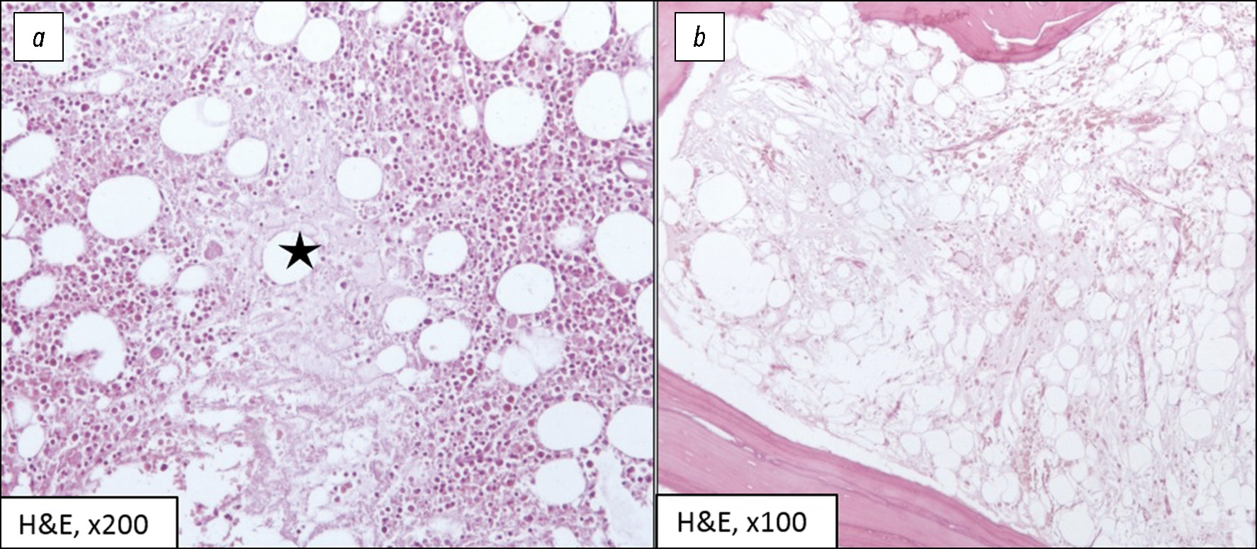 Рис. 8. Микрофотограммы гистологических препаратов срезов спонгиозной кости головки бедра пациента с болезнью Гоше (a) и контрольной группы (b), окраска гематоксилином и эозином, ув. ×200 (a) и ×100 (b). Определяются: a — локальные участки некроза (обозначены звёздочкой), b — обширные поля некроза костного мозга в операционном материале пациентов из контрольной группы.