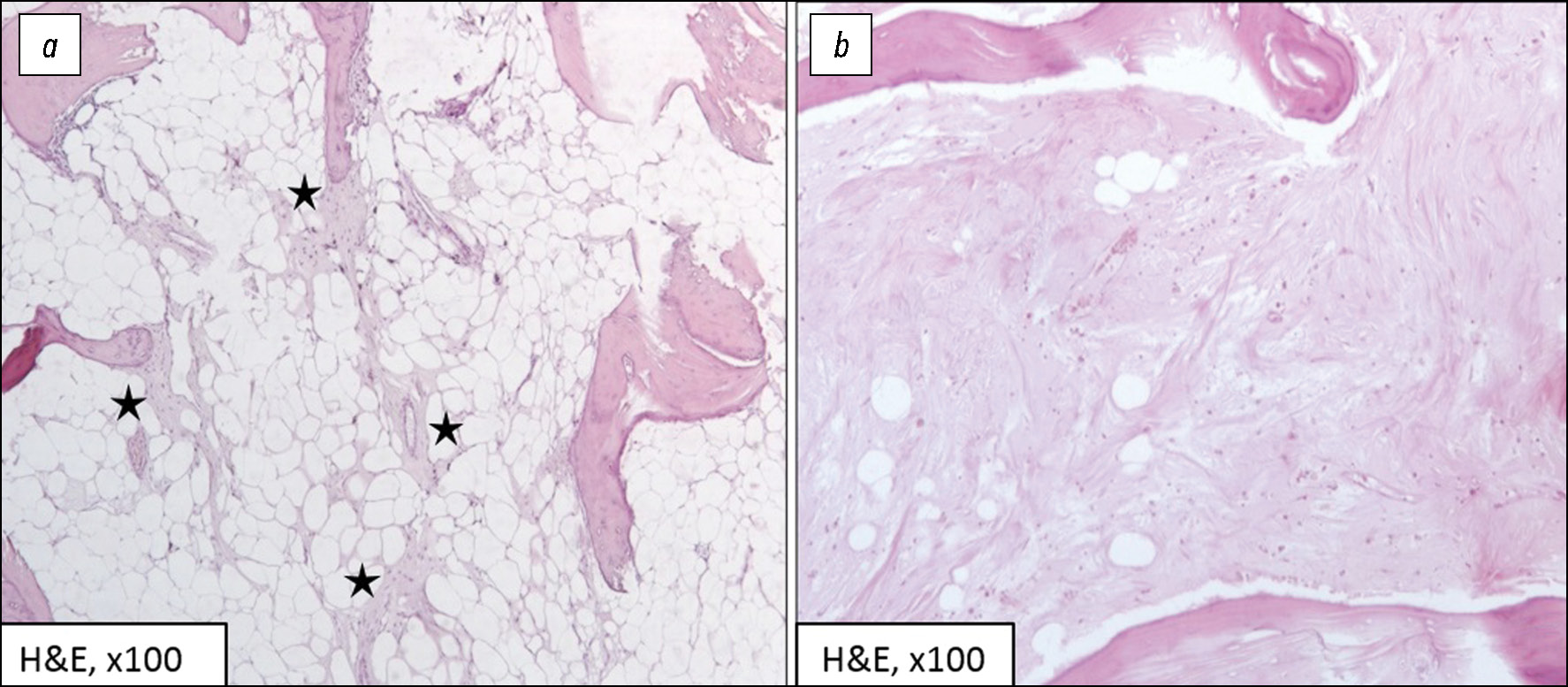 Рис. 9. Микрофотограммы гистологических препаратов срезов спонгиозной кости головки бедра пациента с болезнью Гоше (a) и контрольной группы (b), окраска гематоксилином и эозином, ув. ×100. Определяются: a — мозаичный, преимущественно периваскулярный фиброз (участки фиброза обозначены звёздочками), b — поля грубоволокнистой соединительной ткани в операционном материале пациентов из контрольной группы.