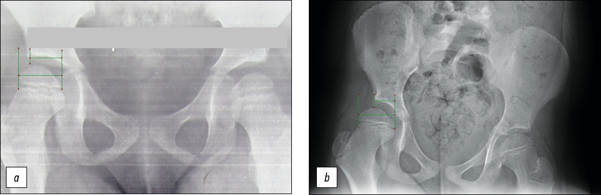 Fig. 1. Patient Р., 8 y.o. Congenital hip dysplasia. а — anterior-posterior radiography of the pelvis, head coverage ratio is 0.74; b — full-length postural radiography of the lower extremities, head coverage ratio is 0.56.