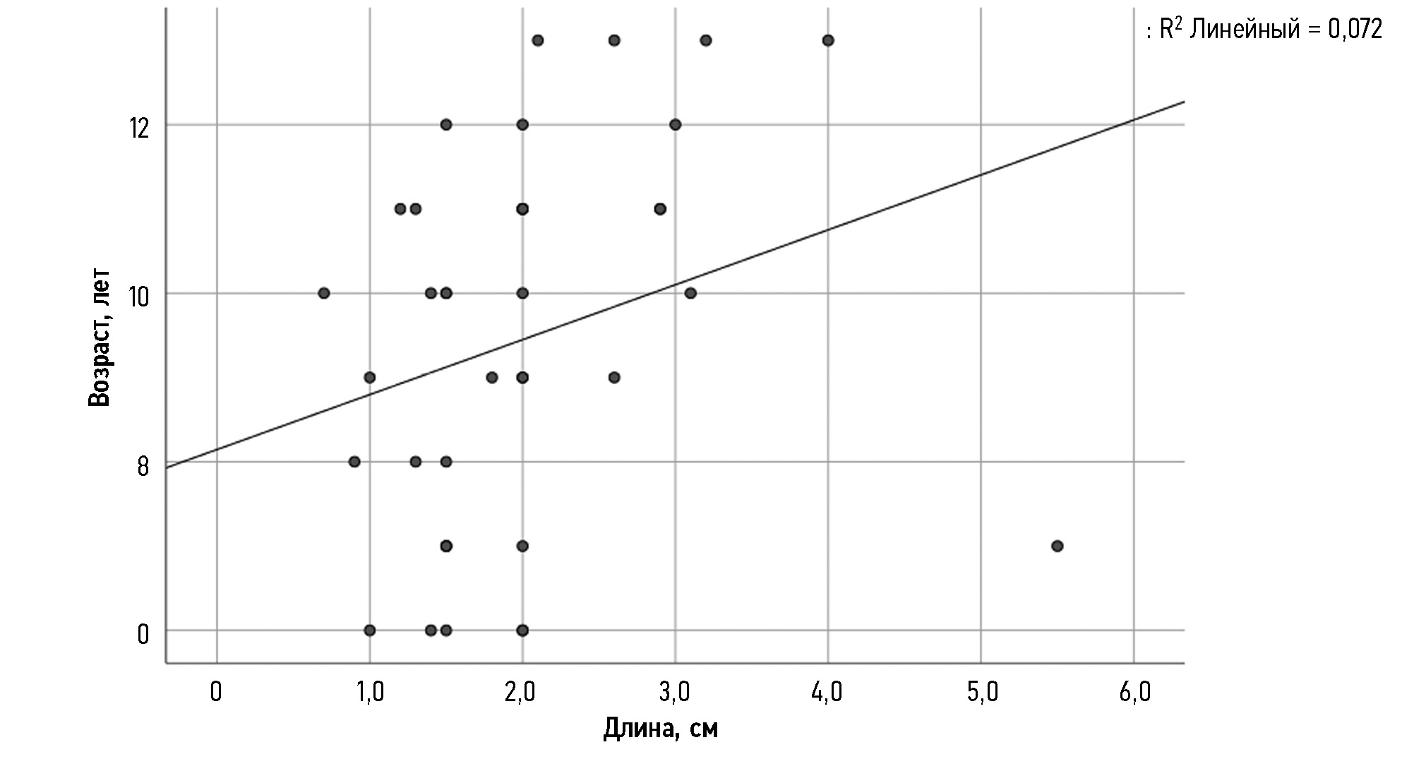 В результате статистического анализа выявлено, что приобретённое укорочение оперированной конечности происходит чаще (соотношение 25 к 13, p=0,019). Зависимость изменения длины от патологии отмечена как статистически незначимая (p=0,525). Также не отмечено зависимости изменения длины нижней конечности от пола пациента (p=0,657), однако выявлена статистическая зависимость от возраста (p=0,049) (рис. 2).