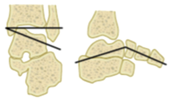 Все пациенты, принявшие участие в исследовании, были вызваны на контрольный осмотр через 8 и 14 недель после операции. Через 2 мес. после операции пациенты проходили КТ-исследование оперированной стопы, где основным показателем была перестройка аутоплантатов с начальными явлениями формирования таранно-пяточного анкилоза. Через 3,5 мес. после операции выполнялись нагрузочные рентгенограммы стоп в трёх проекциях. На рентгенограммах стоп в боковой проекции оценивались следующие параметры: высота таранной и пяточной кости, мм; угол наклона пяточной кости, мм; угол наклона пяточной кости, градусы; угол инклинации таранной кости, градусы; угол наклона таранной кости, градусы; таранно-пяточный угол, градусы (рис. 8). Большеберцово-таранно-пяточное положение и его соосность оценивались на функциональных рентгенограммах стоп в проекции Зальцмана.