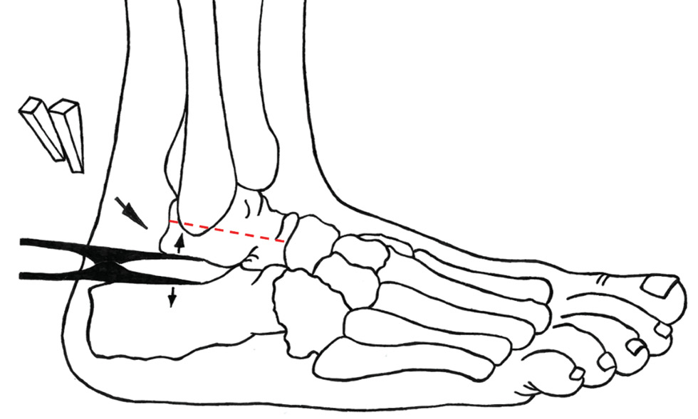 Рис. 2. Дистракция подтаранного сустава, имплантация двух костных аутоплантатов. Пунктиром показано восстановление угла инклинации таранной кости.
