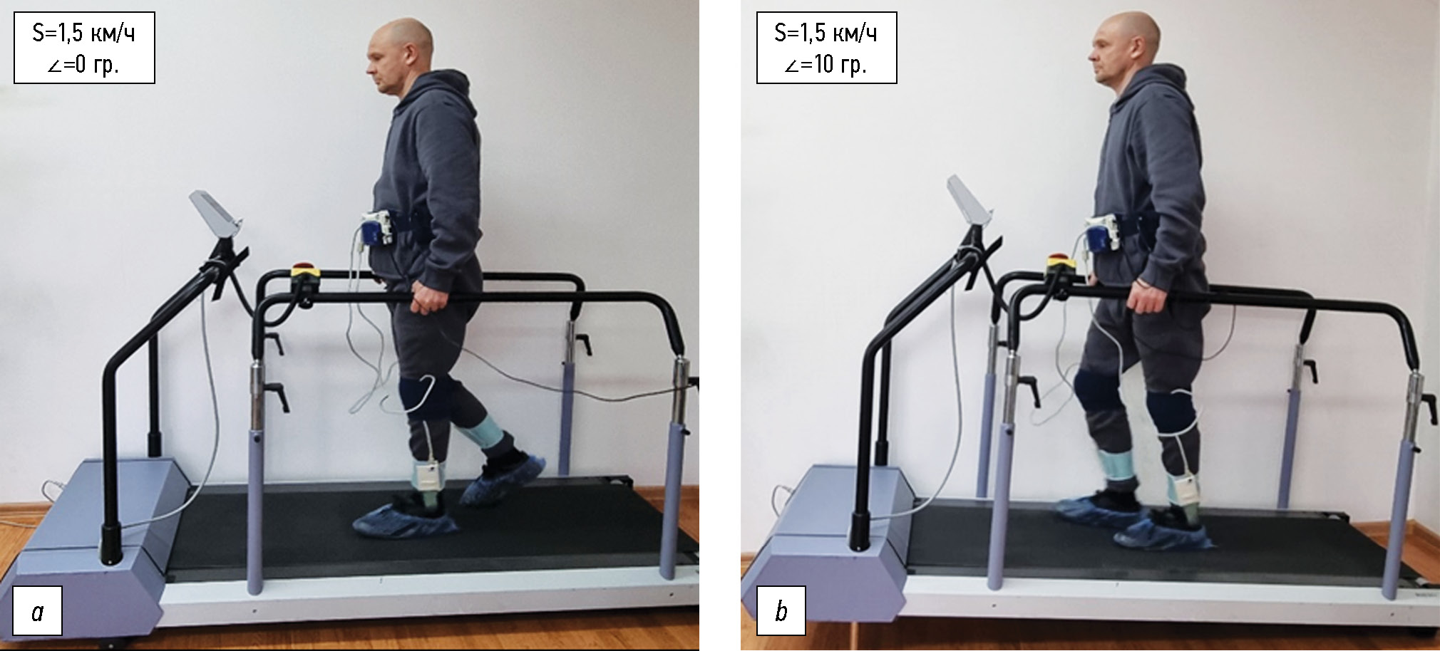 Рис. 4. Тестирование пациента Г. а — ходьба на тредмиле, угол наклона 0 градусов, b — ходьба на тредмиле, угол наклона 10 градусов.