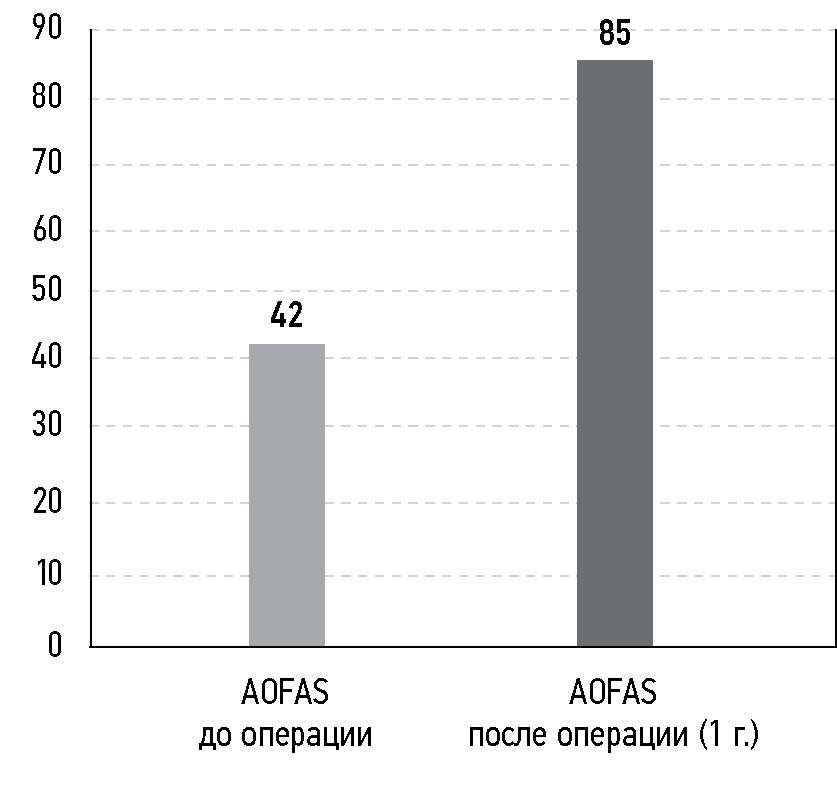 Результаты. Оценка результатов лечения пациентов, принявших участие в исследовании, проводилась в интервале 12 и 24 мес. после операции. Средний период наблюдения составил 26,2 мес. (от 12 до 56 мес.). Средний показатель визуальной аналоговой шкалы до операции составил 5,1 (от 9 до 2), после операции — 0,8 (от 3 до 0), отмечено значительное снижение болевого синдрома (р >0,001). Средний показатель AOFAS заднего отдела стопы до операции составил 42 (от 39 до 72), после операции — 85 (от 60 до 92), также отмечено улучшение показателей опросника (р >0,001). Осложнения наблюдались у 13 пациентов, 2 пациентам потребовалось повторное хирургическое вмешательство. По результатам динамической педобарографии отмечено увеличение показателей пикового и среднего интеграла давления для всей стопы, среднее время контакта пятки значительно уменьшилось — с 640±166 мс до операции до 515±141 мс после операции (р <0,003). Эти показатели были схожи с показателями здоровой стопы — 530±177 мс соответственно.