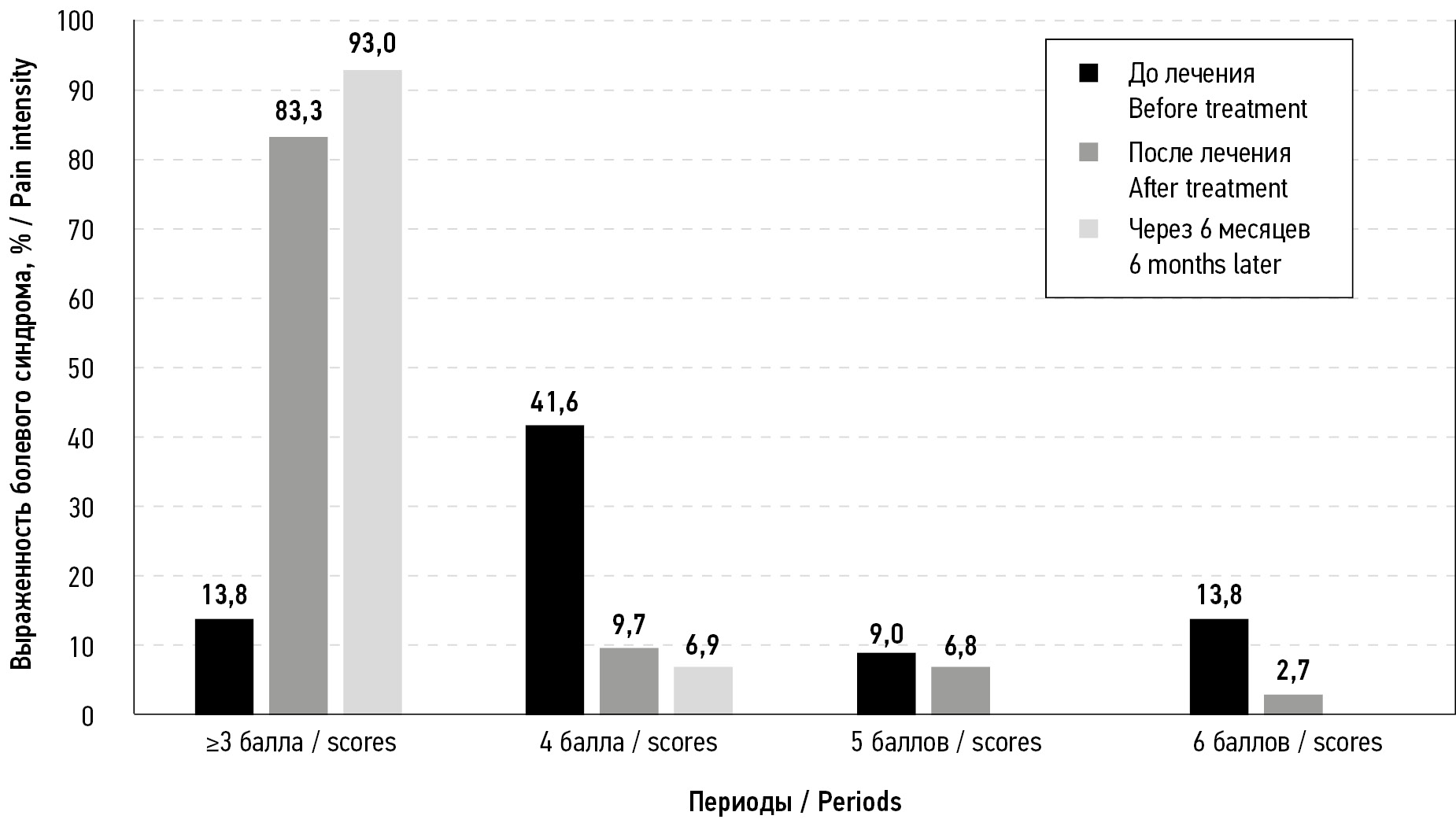 Анализ динамики субъективной оценки болевого синдрома после проведенного курса терапии проводили с использованием критерия χ2. Показано достоверно значимое увеличение доли пациентов со снижением выраженности болевого синдрома до 3 баллов у 15% (35 человек) (р <0,05,) зафиксировано уменьшение доли пациентов с выраженностью болевого синдрома 4 балла у 7% (16 человек) (р <0,05). В исследуемой группе регрессировал болевой синдром, равный 5 баллам, через 6 мес после проведенного курса терапии (см. рисунок).