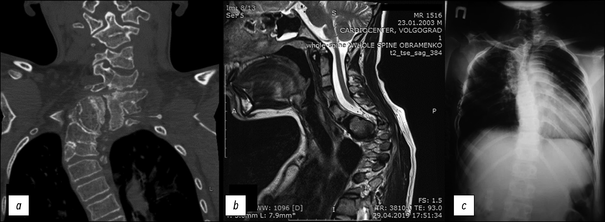Рис. 1. Компьютерная томография (a), магнитно-резонансная томография (b) и рентгенограмма (c) шейно-грудного отдела позвоночника. По данным КТ и МРТ выявлен стеноз позвоночного канала С4–Тh4 с МР-признаками миелопатии. По данным КТ и рентгенографии позвоночника картина врождённой аномалии позвоночника следующая: заднебоковой клиновидный добавочный полупозвонок С7, локальный угловой кифоз на уровне С6–7 позвонка с наличием костного блока тел и задних элементов Th1–3 позвонков и заднебоковым клиновидным полупозвонком Th4–Th5.