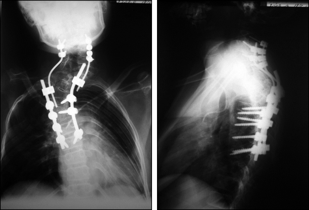 3. Fig. 2. Postural radiographs after the second stage of the operation. The thoracic and cervical rods are connected by a biaxial “domino” connector.
