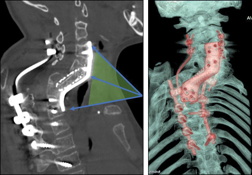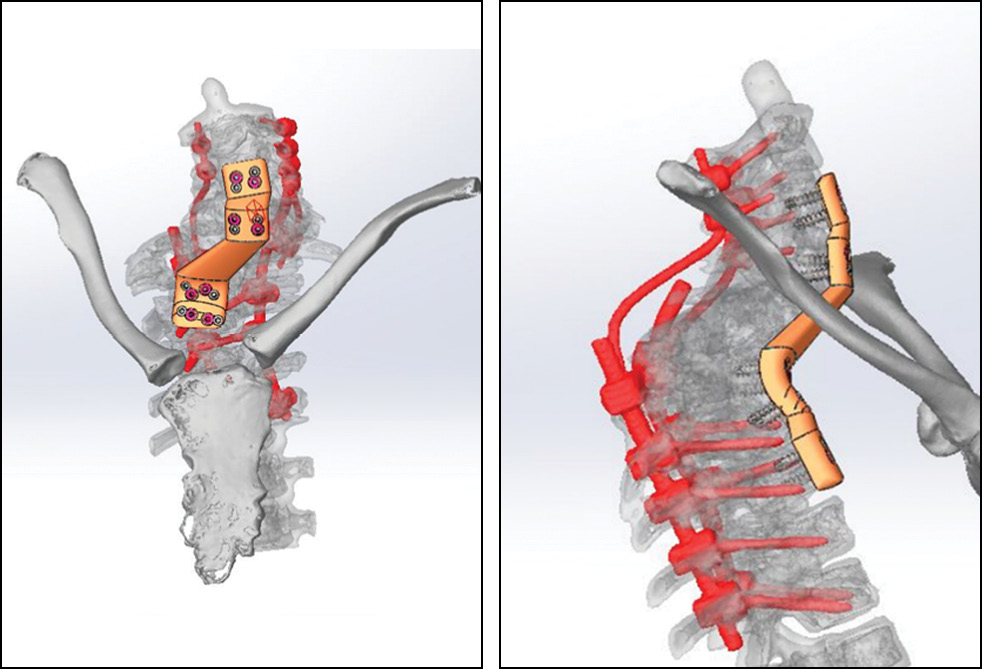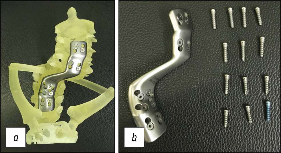 Ввиду сложной геометрии деформации, аномальной анатомии позвоночника применение серийных вентральных пластин в данном случае не представляется возможным. Обусловлено это невозможностью добиться плотного прилегания серийного фиксатора к телам позвонков, несовпадением точек крепления пластины и линейных размеров пластины. Эффективный подход к стабилизации позвоночника заключался в изготовлении индивидуальной пластины, которая имеет практически полную конгруэнтность поверхностей соприкосновения, а этапы её проектирования позволяют рассчитать места установки фиксирующих винтов, траекторию их проведения, в том числе чтобы при их установке не было конфликта инструментария с грудиной или ключицами, что обеспечило отсутствие необходимости стернотомии. С целью планирования всех этапов операции и отработки установки индивидуального имплантата изготовлена полноразмерная индивидуальная 3D-модель позвоночника. В конечном результате хирургического лечения был достигнут полный регресс неврологического дефицита со стабилизацией позвоночника.