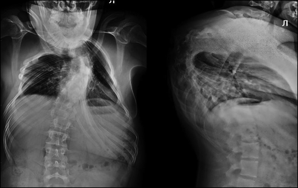 По данным постуральной рентгенографии позвоночника в двух проекциях: картина левостороннего кифосколиоза грудного отдела позвоночника IV степени, угол Cobb сколиотической дуги 90° с вершиной Th6–7, угол кифотической дуги 115° с вершиной Th6–7 (рис. 7).