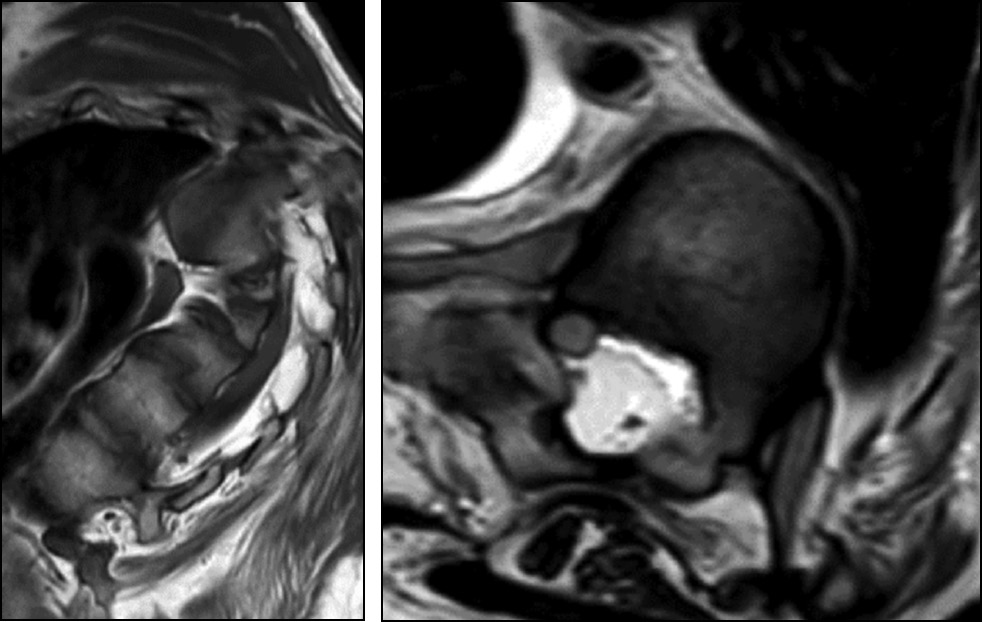 Пациенту проведено обследование: спиральная компьютерная томография (СКТ), СКТ-миелография и МРТ грудопоясничного отдела позвоночника. По данным МРТ, на уровне Th5–Th7 позвоночный канал заполнен жировой тканью, спинной мозг смещён вправо, ликворное пространство на этом уровне не прослеживается, признаки миелопатии не определяются (рис. 8).