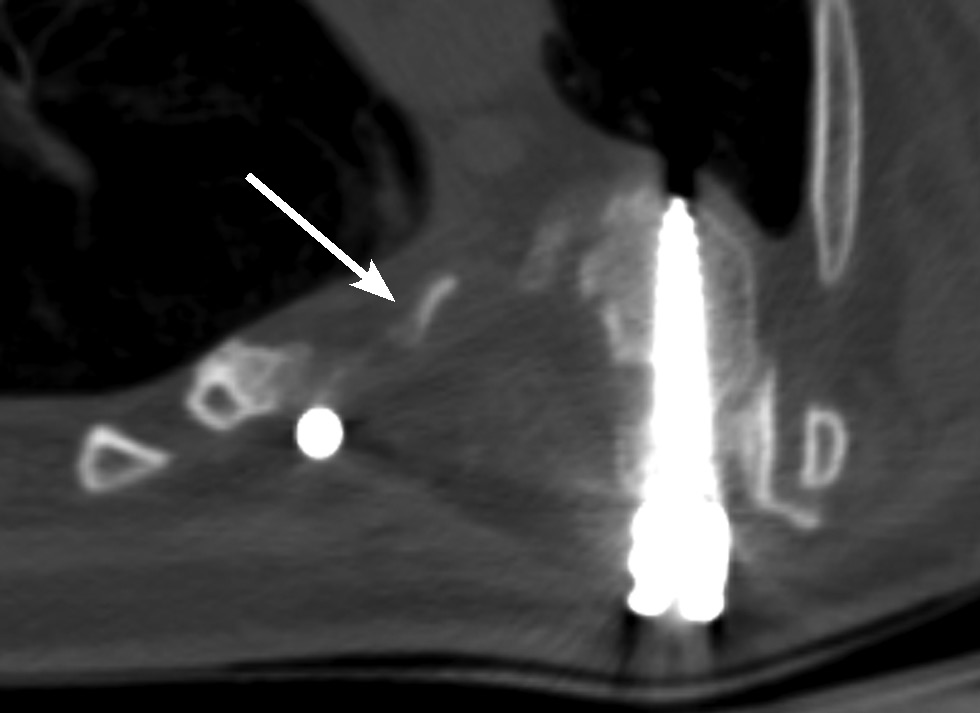 По данным контрольной постуральной рентгенографии и компьютерной томографии положение металлоконструкции корректное, признаков нестабильности и мальпозиции опорных элементов не отмечается. Пациент был выписан на амбулаторное лечение через 23 дня после проведённой операции.