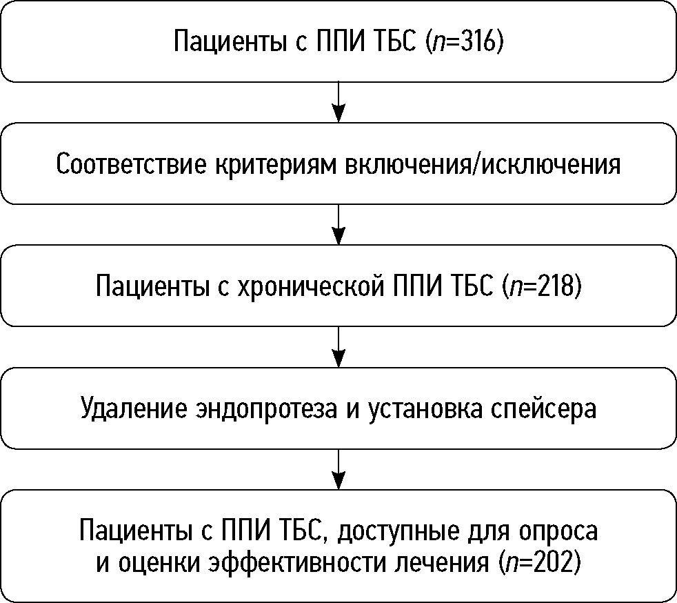 Ретроспективное одноцентровое когортное исследование проведено на основании медицинской документации и телефонных опросов 316 пациентов с ППИ ТБС, которым было выполнено первичное эндопротезирование (рис. 1). Первый этап лечения выполняли в отделении гнойной хирургии, второй — в профильных ортопедических отделениях в период 2014–2018 гг.