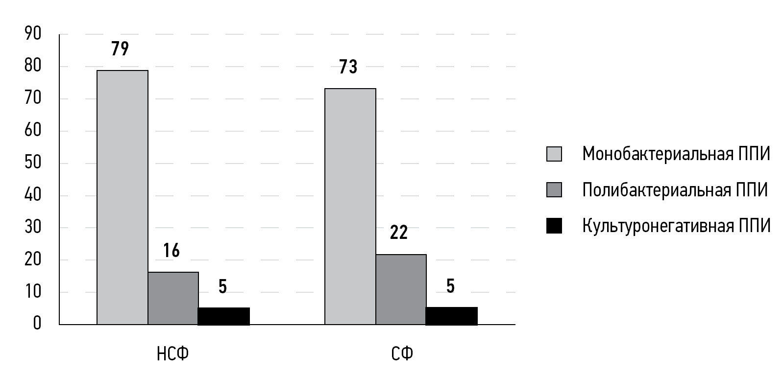 Note (here and in Table 5). ППИ — periprosthetic joint infection, NFF — non-fistulous form, СФ — fistulous form, Gr(+) — gram-positive pathogens, Гр(-) — gram-negative pathogens.