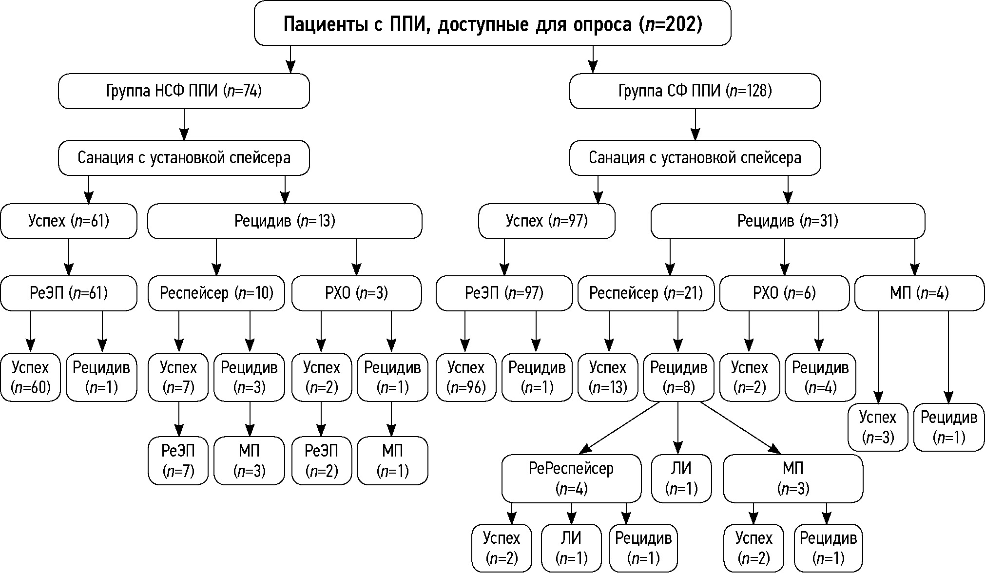 Note. ППИ — periprosthetic joint infection, НСФ — non-fistulous form, СФ —fistulous form, РеЭП — revision hip arthroplasty, респейсер — spacer exchange, РХО — radical wound debridement, реРеспейсер — second spacer exchange, МП — muscle plastic surgery, ЛИ — fatal outcome.