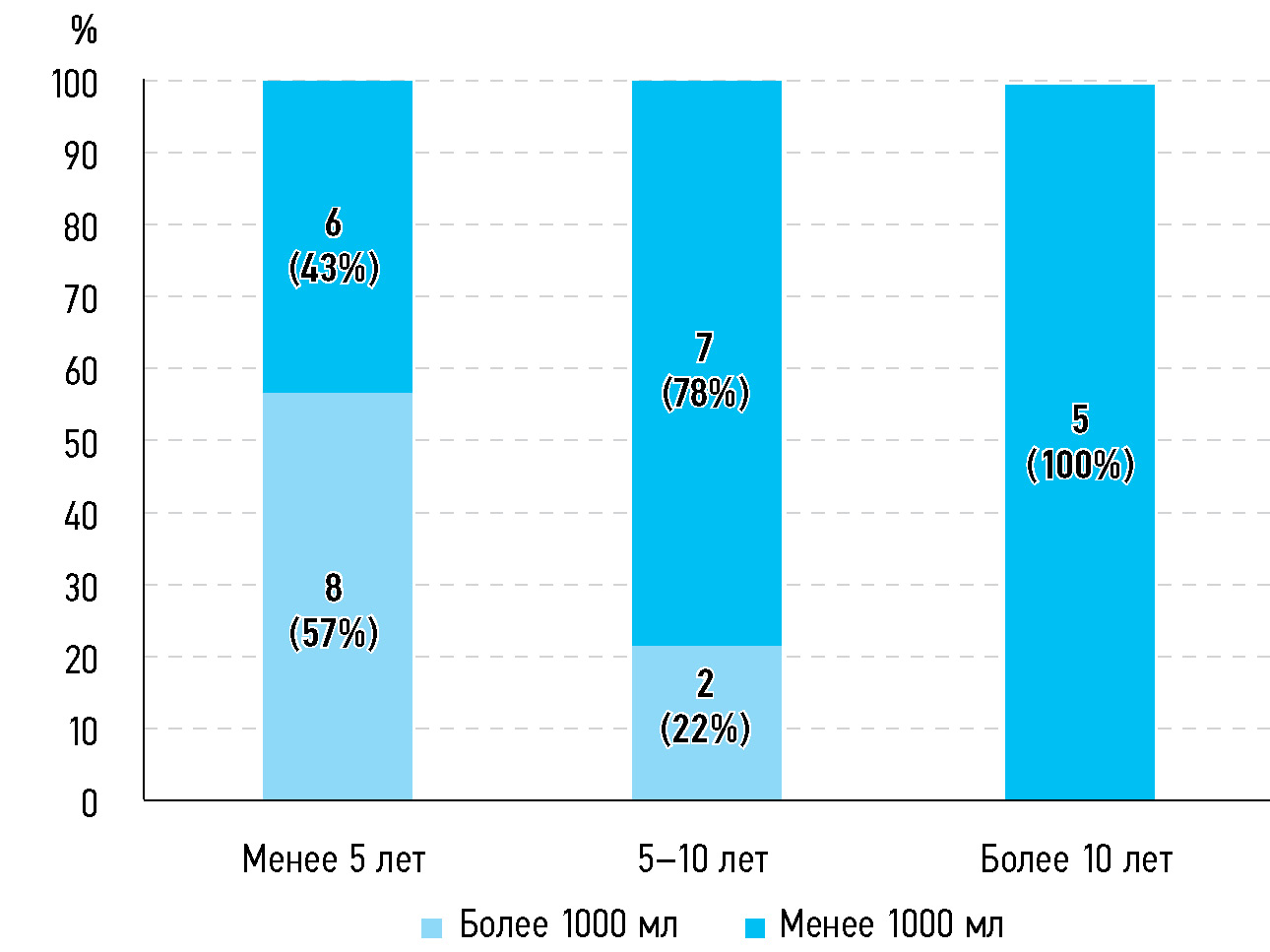 Мы обнаружили, что высокая интраоперационная кровопотеря ассоциирована с длительностью предшествующей ЗФТ. У пациентов, которым ЗФТ проводилась менее 5 лет (n=14), средняя интраоперационная кровопотеря составила 1250 мл (от 200 до 3300 мл). Пациенты, получавшие ЗФТ 5 лет и более (n=14), имели значительно более низкие цифры кровопотери — от 300 до 1800 мл (средняя — 475 мл), сравнимые с кровопотерей при ТЭТБС у пациентов без БГ, а также с нормальными лабораторными показателями гомеостаза. Только в одном случае избыточная кровопотеря 1450 мл была связана с хирургическим кровотечением в технически сложной ситуации. В табл. 3 отражены некоторые клинико-лабораторные показатели пациентов с БГ, которым ТЭТБС выполнено на малых сроках ЗФТ. В случае длительности ЗФТ менее 5 лет доля операций с кровопотерей более 1000 мл составила 57%, при длительности ЗФТ 5–10 лет — 22%, более 10 лет — 0% (рис. 1) (p=0,047).