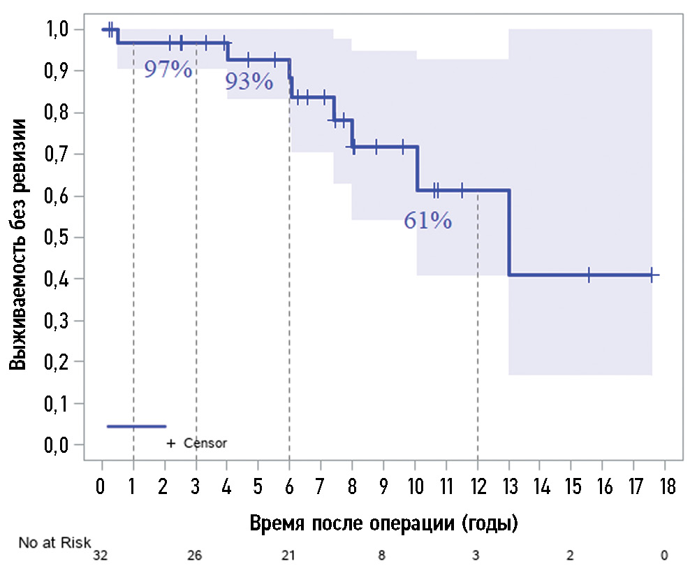 Анализ долговечности имплантатов для ТЭТБС у пациентов с БГ представлен на рис. 2. Выживаемость без ревизии на сроках 3, 6 и 12 лет после операции составила 97, 93 и 61% соответственно.