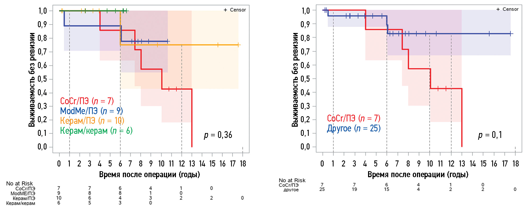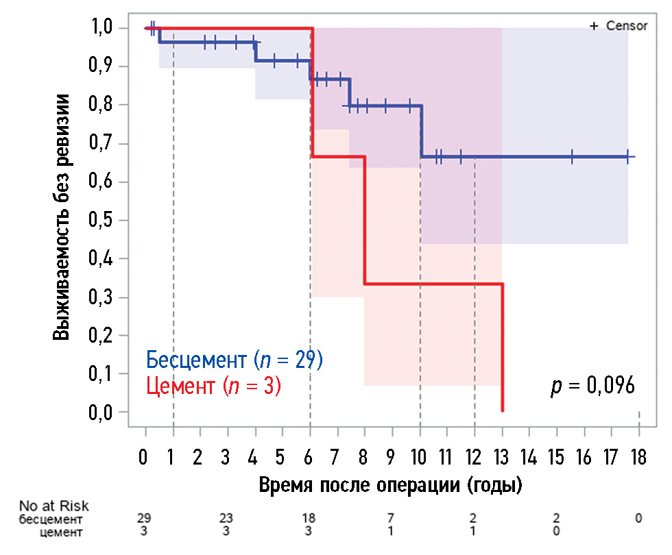 В качестве конечной точки для анализа долговечности функционирования эндопротеза использовали время до ревизионной операции. Время до целевого события рассчитывалось как длительность временного промежутка от даты установки эндопротеза до даты ревизионной операции. Пациенты, у которых не возникло необходимости в проведении ревизионной операции, были цензурированы на дату последнего контакта. Для оценки распределений использовали оценки Каплана–Мейера, для оценки статистической значимости различий в группах применяли логранговый тест.
