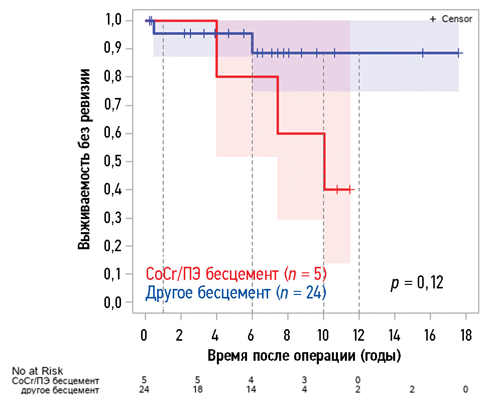 Результаты. Хорошие и отличные результаты ТЭТБС получены в 87% случаев при наблюдении от 1 до 10 лет (медиана — 7 лет). Причинами неудовлетворительных результатов в десятилетний период наблюдения были перипротезная инфекция (2 случая) и асептическое расшатывание (3 случая). В обоих случаях перипротезной инфекции причиной служил костно-суставной туберкулёз, не диагностированный на догоспитальном этапе. Высокая интраоперационная кровопотеря была ассоциирована с длительностью заместительной ферментной терапии (ЗФТ). При ЗФТ менее 5 лет доля операций с кровопотерей более 1000 мл составила 57%, 5–10 лет — 22%, при длительности более 10 лет — 0% (p=0,047). Выживаемость имплантатов без ревизии на сроках 3, 6 и 12 лет после операции составила 97, 93 и 61% соответственно. В случае цементной фиксации имплантатов выживаемость без ревизии на сроке 12 лет составляла 33%, бесцементной — 67%. На сроке 12 лет после операции выживаемость имплантатов без ревизии составила 43% для пары трения CoCr/ПЭ и 83% в случае остальных пар трения (К/К, К/ПЭ, МодМе/ПЭ).