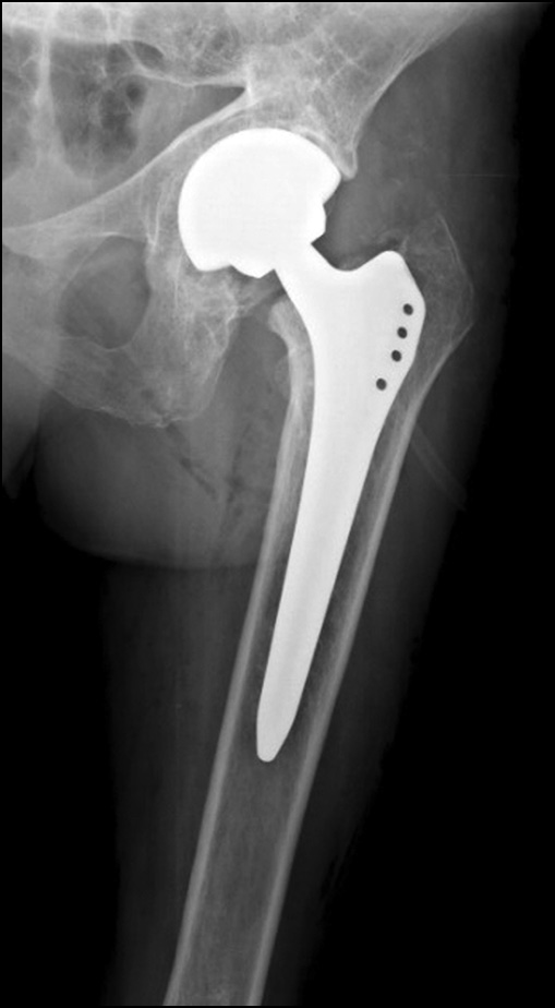 Fig. 6. Proximal fixation using a Zweimüller-type femoral component in a patient with Gaucher disease and widened femoral canal.
