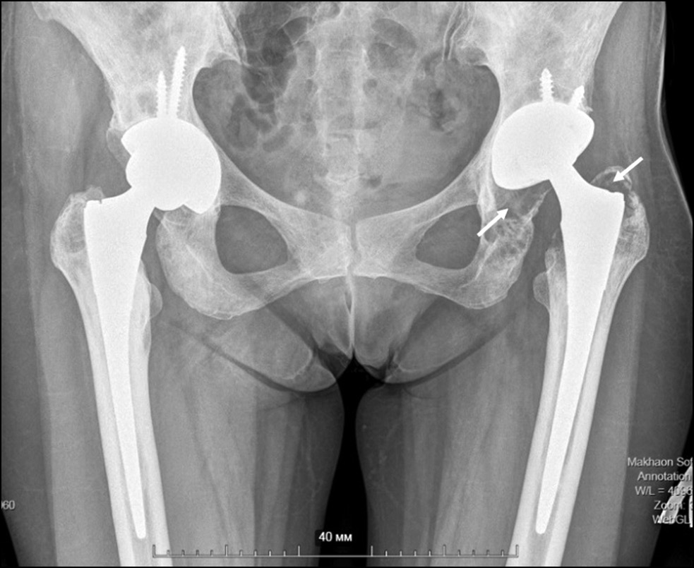Рис. 8. Остеолитическая гранулёма (указана стрелками) у пациентки с болезнью Гоше. 10 лет после первичного тотального эндопротезирования тазобедренного сустава. Пара трения — кобальт-хромовый сплав по полиэтилену.
