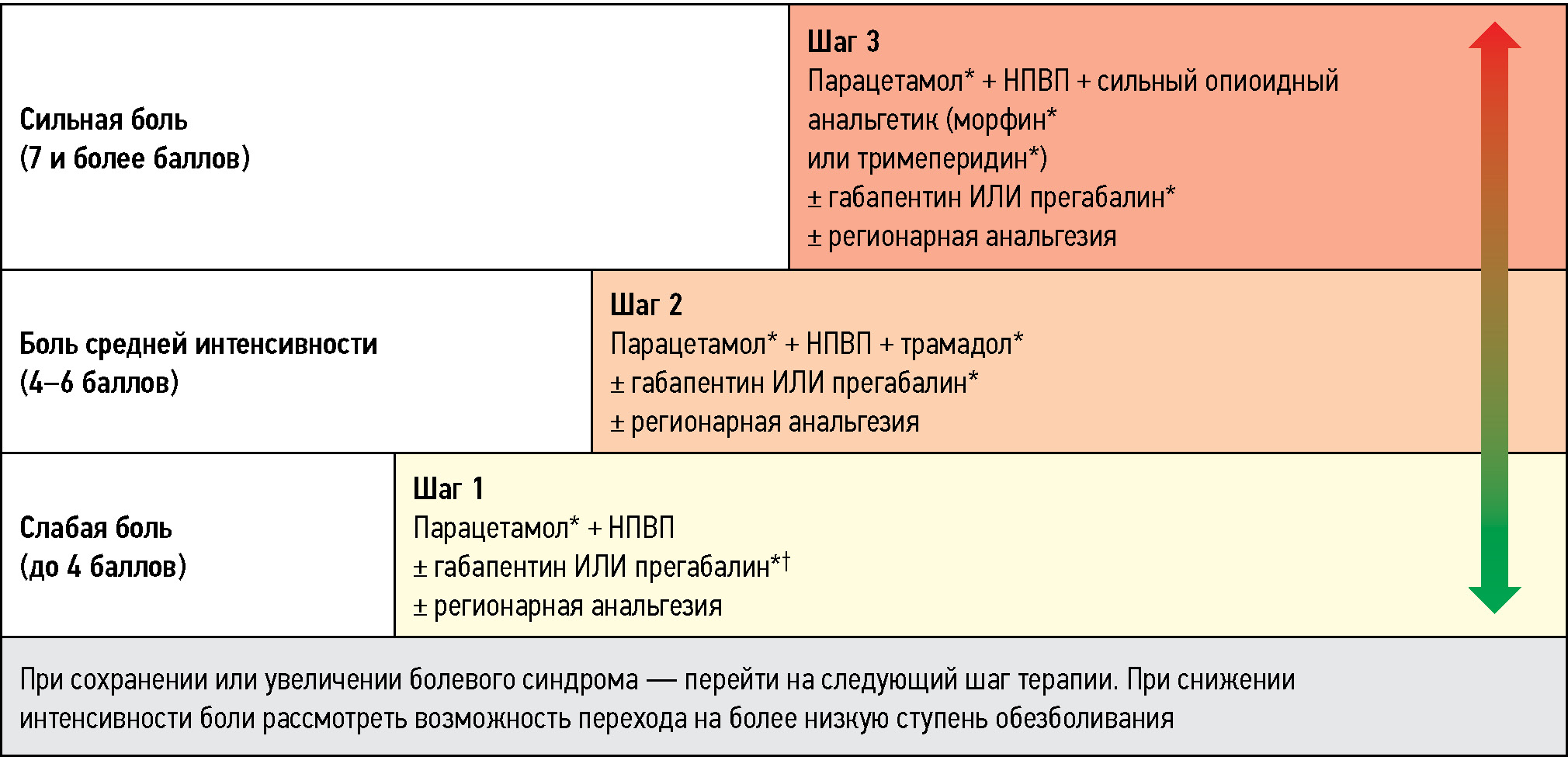 Целевой уровень субъективной оценки болевого синдрома — 3 балла и менее (при оценке по ЦРШ от 0 до 10) [21, 22]. Боль средней и высокой интенсивности в послеоперационном периоде требует назначения обезболивающей терапии [23]. Значения выше целевого уровня оценки боли считаются пороговыми для назначения дополнительной обезболивающей терапии, которая должна быть назначена в течение 30 минут с момента получения результата оценки [24, 25].