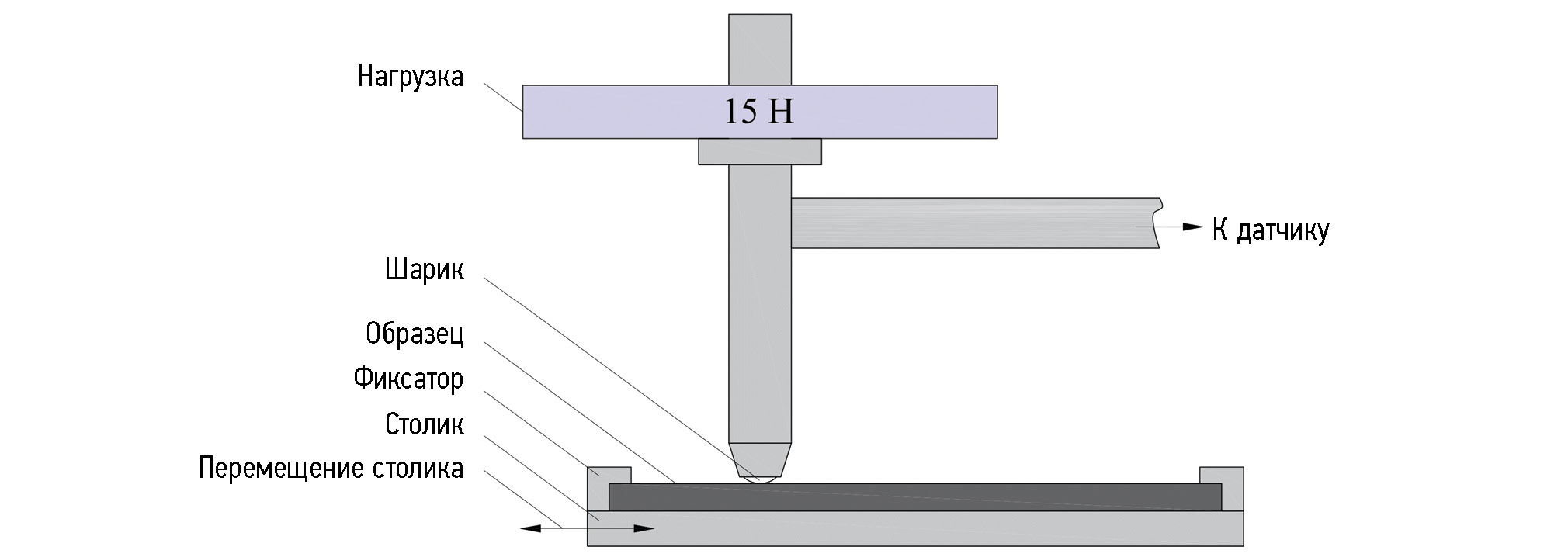 Исследования проводились в нормальных условиях. Исследование трибологических свойств поверхностей скольжения оксида алюминия (Al2O3) по композиту СВМПЭ-НПГ выполнялось с использованием возвратно-поступательного трибометра Nanovea по типу «шарик на диске» (рис. 1). Параметры испытаний для измерения коэффициента трения указаны в табл. 1. Все исследуемые образцы сравнивались с коммерческими марками СВМПЭ компании Ticona GUR 1020 и GUR 1050, уже широко использующимися в медицине, в частности в области эндопротезирования.
