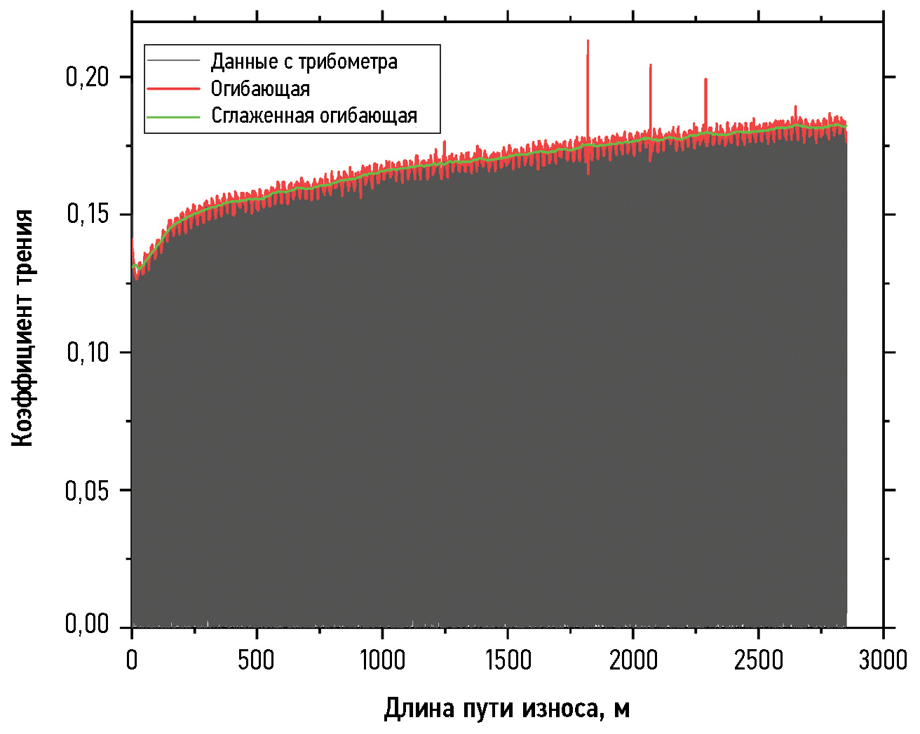 Полученные с трибометра данные (изменение коэффициента трения µ от длины пути износа) обрабатывались следующим образом: строилась огибающая коэффициента трения, затем полученная кривая сглаживалась с применением смежного усреднения. Характерный вид получаемых данных (концентрация нанопластин графита — 0,093 мас.%) и их последующая математическая обработка приведены на рис. 2.