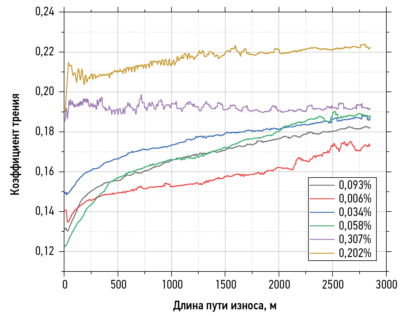 Изменение коэффициента трения от длины пути износа для образцов с содержанием нанопластин графита от 0,006 до 0,307 мас.% показано на рис. 3. Значения среднего коэффициента трения (µср) и среднего максимального коэффициента трения (µср.макс), полученного для сглаженной огибающей, приведены в табл. 2.