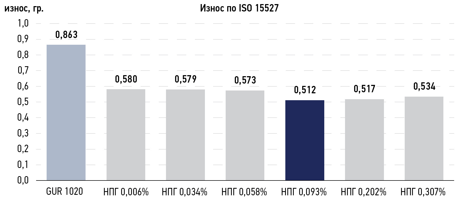 Так, снижение массы образца GUR 1020 после трёхчасового воздействия водно-песчаной суспензии составило 0,8632 грамма. Потеря массы образцов синтезированных композитов СВМПЭ-НПГ значительно ниже, и уже при содержании нанопластин графита 0,006 мас.% материал имеет существенно более высокую износостойкость, снижение массы данного материала составило 0,5804 грамма за 3 часа, что примерно на 33 % ниже, чем аналогичный показатель у марки GUR 1020. Дальнейшее увеличение содержания нанопластин графита в матрице СВМПЭ до 0,1–0,2 мас.% приводит к росту износостойкости: изменение массы образцов составляет порядка 0,51–0,52 грамма.