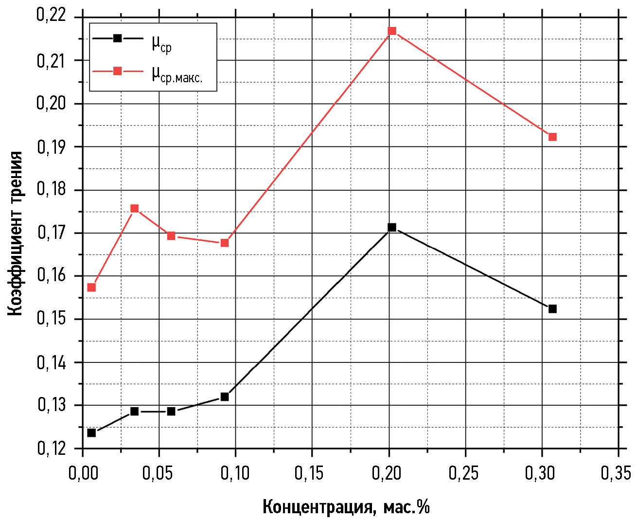 Сравнение полученных в ходе измерения коэффициента трения результатов позволяет утверждать, что минимальные значения средних коэффициентов трения µср, µср.макс. наблюдаются в областях низких концентраций наполнителя (N <0,1 мас.%). Максимальных значений коэффициент трения достигает в области концентраций N ~0,2 мас.% (рис. 6).