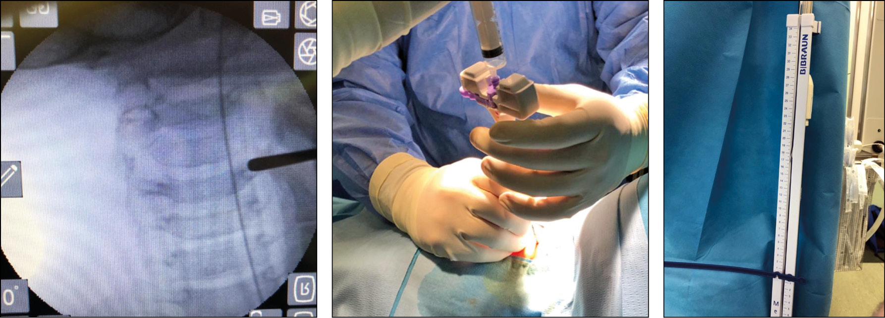 Рис. 1. Пункция аневризмальной кисты С4-5 с измерением давления по шкале в мм.водного столба