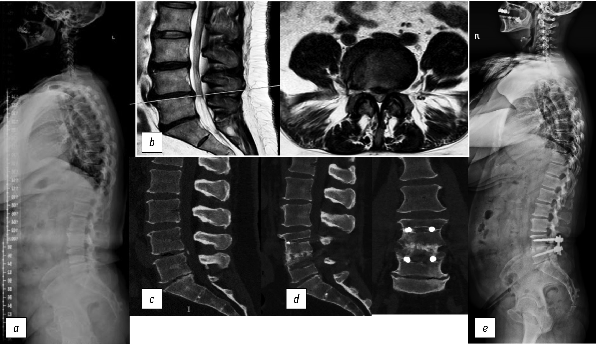 Рис. 1. Пациентка Г.: a — постуральная рентгенография позвоночника в боковой проекции перед операцией, b — МРТ поясничного отдела позвоночника в сагиттальной и аксиальной проекциях до операции, c — КТ поясничного отдела позвоночника в сагиттальной проекции перед операцией, d — КТ поясничного отдела позвоночника в сагиттальной и фронтальной проекциях после операции, e — постуральная рентгенография позвоночника в боковой проекции после операции.