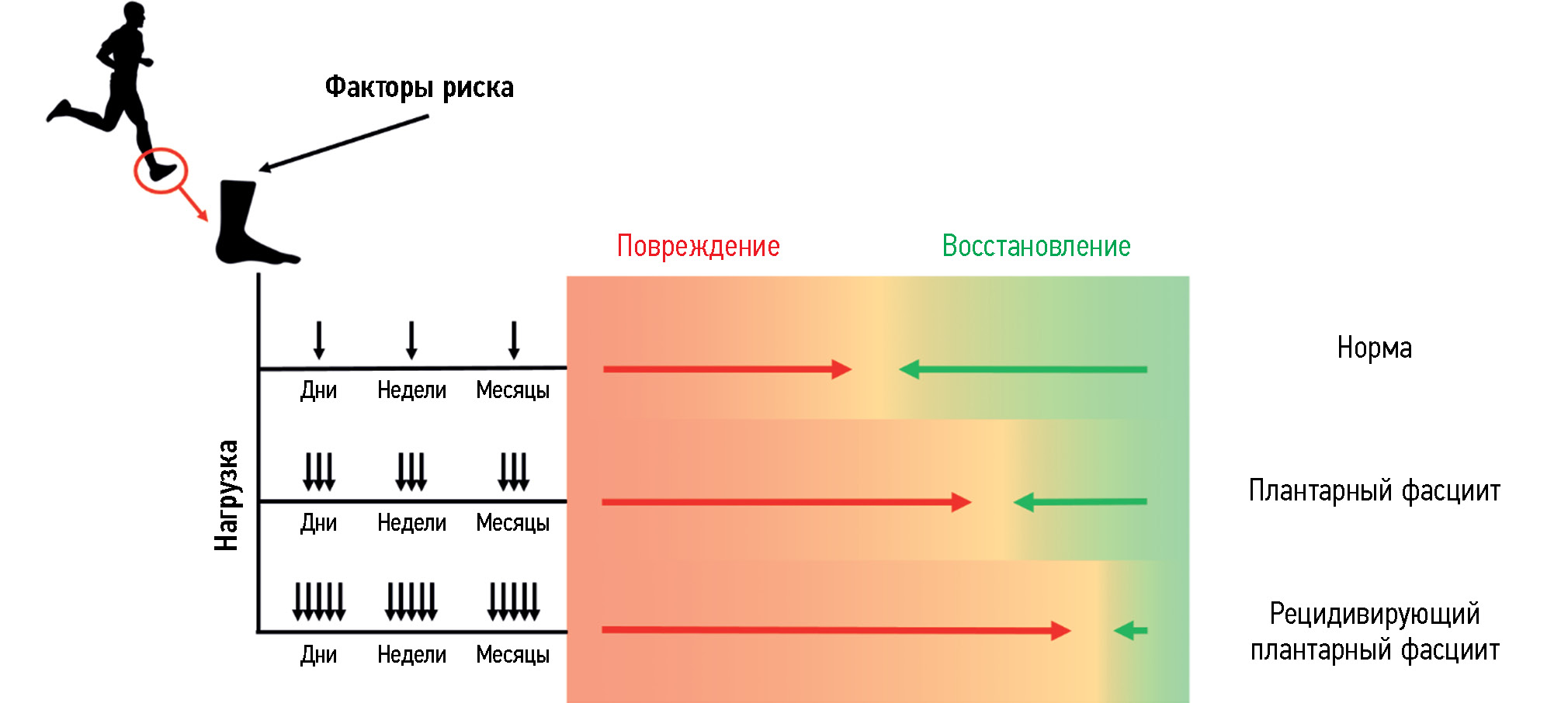 Плантарный фасциит, по текущим представлениям, является следствием повторяющейся ударной нагрузки на пяточную область [4, 5]; он сходен по течению с тендинопатией [6] и часто ассоциирован с бегом [7]. В результате избыточной нагрузки (по причине слишком частых тренировочных стимулов или однократного стимула, превышающего адаптивные возможности организма) на пяточную область запускаются дегенеративно-воспалительные изменения подошвенного апоневроза, что при последующем дисбалансе воспалительных и регенеративных процессов приводит к развитию клинически выраженного болевого синдрома (рис. 1) [8, 9]. В данном контексте неудивительно, что ПФ хуже поддаётся лечению у спортсменов и склонен к частому рецидивированию [10].