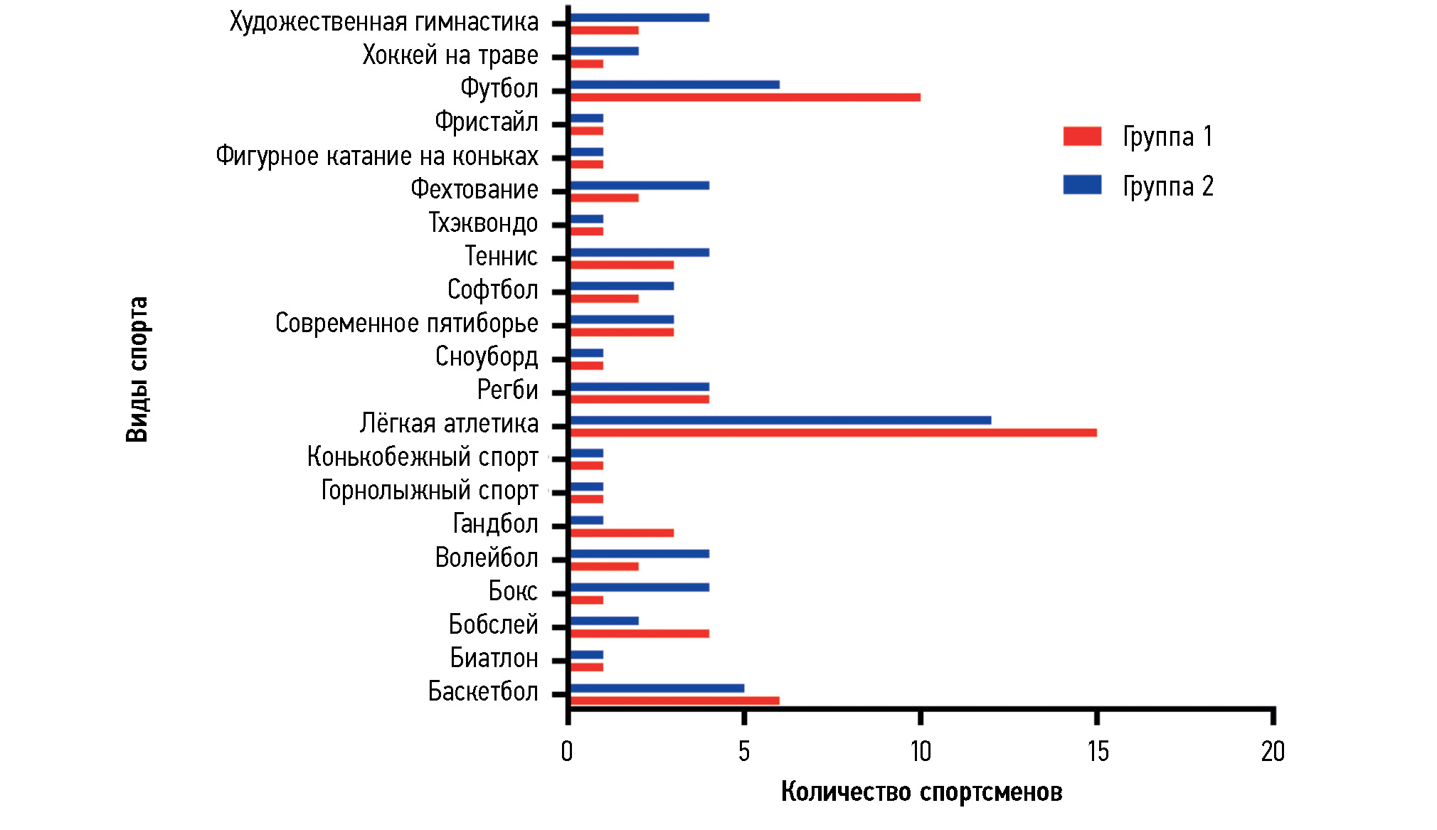 Рис. 2. Распределение спортсменов групп 1 и 2 по видам спорта.