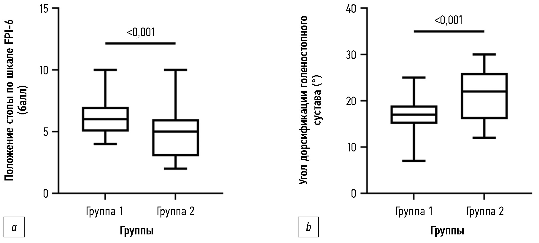 4. Fig. 3. Foot position according to the FPI-6 scale (a) and the angle of ankle dorsiflexion (b) in the studied groups.