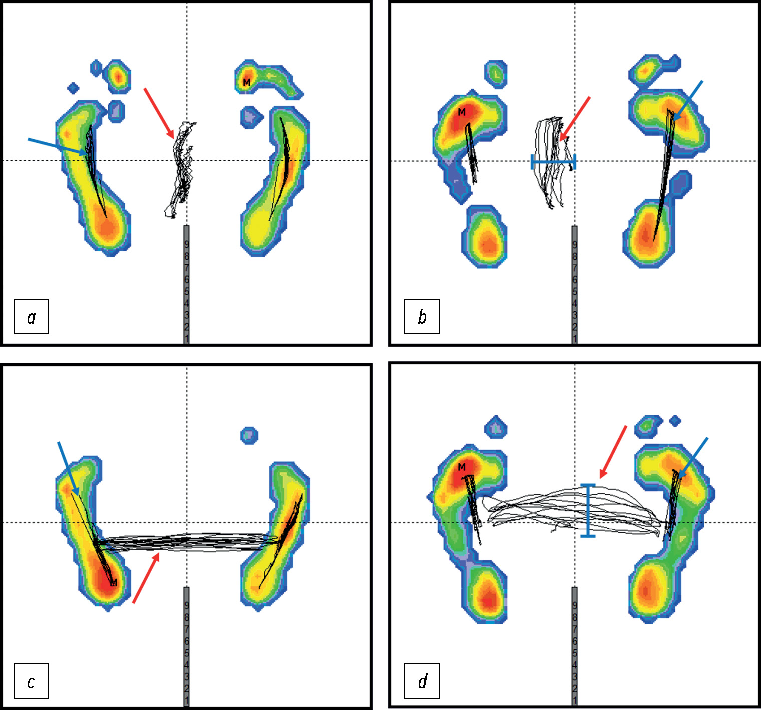 7. Fig. 6. Baropodograms of sagittal (a, b) and frontal (c, d) dynamic tests of athletes with plantar fasciitis. The red arrow indicates the displacement and deformation of the COP, the blue arrow highlights the deformation and disintegration of the pressure vectors under the feet, and the blue line marks the amplitude of the COP.