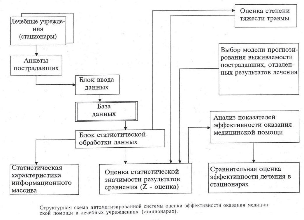 Представляется целесообразным использовать разработанные методики при создании Государственной системы оценки эффективности лечения пострадавших с механическими повреждениями. В основу ее может быть положена автоматизированная система оценки эффективности оказания медицинской помощи в лечебных учреждениях (стационарах), разработанная в ЦИТО (см. схему).